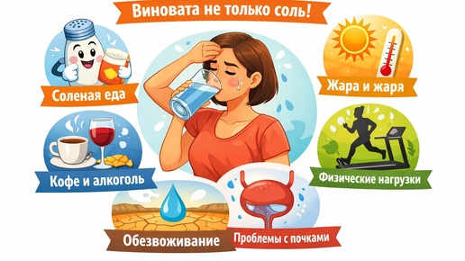 Сильная жажда — это важный сигнал организма, который нельзя игнорировать. Чаще всего причиной жажды становится избыток солёной пищи. Соль (натрий) нарушает водно-солевой баланс: она «притягивает» и удерживает воду вне клеток, что приводит к их обезвоживанию. В ответ мозг получает тревожный сигнал и требует новую порцию жидкости, чтобы восстановить равновесие. • Физическая активность и жара. При интенсивных тренировках или в жаркую погоду организм теряет много влаги через потоотделение, что усиливает жажду...