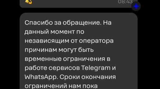 Поддержка Tele2: По независящим от оператора причинам могут быть временные ограничения в работе сервисов Telegram и WhatsApp*