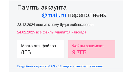 Mail.ru прислал пенсионеру уведомление, что его аккаунт удалят, т.к. он якобы занимает 9ГБ места. Сценария почистить, не предложили. Войти в аккаунт и узнать причину не получилось! Прибегает сосед весь в слезах. Ему 84 года. Mail.ru прислал ему уведомление, что его email будет уничтожен. Якобы файлы занимают более 9ГБ места. Пенсионер не пользуется никакими сервисами VK кроме e-mail. У него нет Видео, Соцсетей и прочего мусора. Почьту использует редко, только чтобы почитать поздравление с ДР от Собянина и получить результаты анализов...