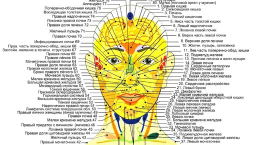 Наше лицо, как ладони и ступни - является проекцией внутренних органов. Соответственно, состояние кожи лица напрямую зависит от правильной работы желудка, печени, кишечника, лёгких и так далее. Сперва рассмотрим карту соответствия зон на лице внутренним органам. Эта карта, пожалуй, самая полная из всех, что я встречала. Она отражает практически все внутренние органы. Тем лучше для понимания источника проблемы. Но в этой статье мы рассмотрим самые ключевые места образования сыпи, прыщей и угрей на лице...