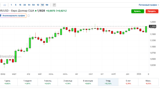 Отвечу на вопрос подписчика о своем видении тенденций по паре евро/доллар на текущий год. За последний год эта пара выросла на 13%, что очень существенно для ведущих мировых валют, и конкретно в начале 2026 года (точнее - в последнюю неделю тоже очень заметно растет. Евро укрепляется по отношению к доллару, и эта же тенденция выступает главным драйвером снижения индекса доллара, где рассчитывается его соотношение к корзине из шести мировых валют, в которой евро имеет вес более половины - 55%. График тут, как видите, будет зеркальным...