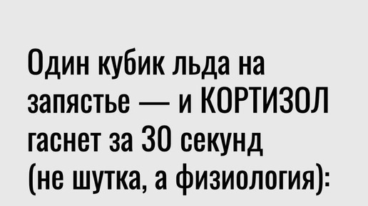 «Один кубик льда на запястье, и кортизол гаснет за 30 секунд. Не шутка, а физиология! Нервные рецепторы напрямую связаны с мозгом. Лед дает сигнал, что все не так опасно, и система «бей или беги» выключается. Этот способ используют в скорой, психиатрии и армии, чтобы вернуть человека «здесь и сейчас».