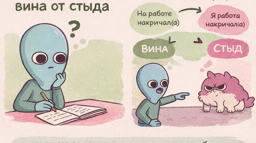Отличие вины от стыда: почему важно различать эти эмоции В терапии есть один очень важный момент, без которого работа с чувством вины часто «проваливается». Это умение чётко различать два похожих, но принципиально разных чувства — вину и стыд. Пока этого разделения нет, человек может: …и при этом чувствовать себя всё хуже и хуже. Почему так происходит? Потому что на самом деле он имеет дело не с виной, а со стыдом. Вина и стыд: принципиальная разница 🔹 Стыд — это переживание про Я Стыд звучит так: Стыд затрагивает всю личность целиком...
