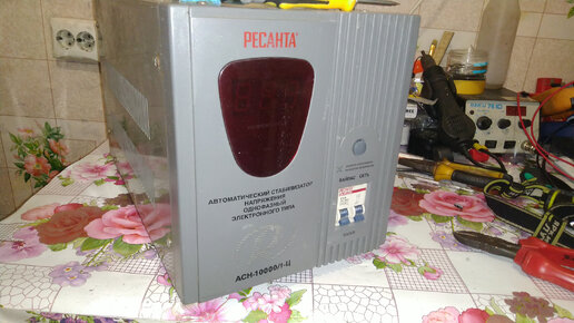 Аппараты фирмы РЕСАНТА хоть и имеют немалое количество негативных отзывов, при должном уходе и контроле способны на многое. Естественно, если не перебарщивать с условиями окружающей среды. Нашему пациенту не повезло с погодными условиями. Не, внешне наш пациент красаучик. Стабилизатор РЕСАНТА АСН - 10000/1-ц предназначен для стабилизации напряжения в сети, а заявленная выходная мощность составляет 10 кВт при напряжении в сети от 160 до 240 вольт, о чем есть надпись на задней крышке. То есть, теоретически можно подключить даже индукционную плиту с несколькими конфорками...