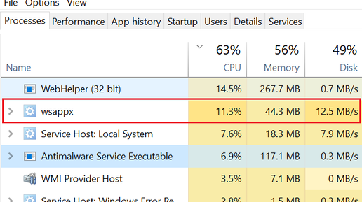 Почему процесс WSAPPX сильно нагружает диск и процессор в Windows 10