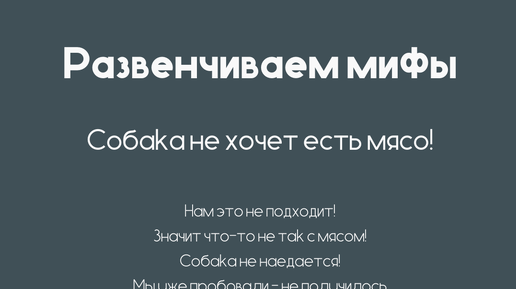 Развенчиваем мифы: Нам натуралка не подходит! Если собака не хочет есть мясо - значит что-то не так с этим мясом! Собака страдает, когда у нее нет корма в открытом доступе! Мы пробовали кормить мясом - не ест, значит никогда не будет! Говорить, что натуралка не подходит вашему псу - утверждать, что свежие овощи наносят вред вашему организму, а фастфуд полезен. No comments. Разберемся с остальными утверждениями Действительно, такая проблема возможна - собака отказывается есть свежее мясо. Дело не в мясе, дело в привычках...