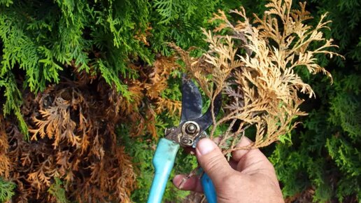 Часто туи и можжевельник вдруг начинают засыхать, появляются проплешины, и выглядят они не эстетично. Опытный садовод поделился приемами, которые помогут привести растения в божеский вид. Процесс спасения хвойника долгий и может занять пару лет, поэтому требуется запастись терпением и действовать. Для начала необходимо очистить туи от сухих веток с помощью секатора. Хвойники не способны сами сбрасывать отмершие ветви. Их удаляют вручную. Затем нужно укоротить верхушку растения, срезав точку роста на 10-15 см...