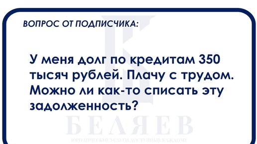 Можно ли списать задолженность по кредиту? ❌💰 Вопрос подписчика: «У меня долг по кредитам 350 тысяч рублей. Плачу с трудом. Можно ли как-то списать эту задолженность?» Ответ юриста: 🔹 1. Полностью списать долг можно только через процедуру банкротства (ФЗ-127). Долг от 500 тыс. рублей → банкротство через суд. Долг до 500 тыс. → возможно внесудебное банкротство через МФЦ (если нет имущества и исполнительных производств). 🔹 2. Другие варианты Реструктуризация долга (изменение условий кредита)...