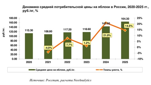 В ходе ежемесячного мониторинга розничных (потребительских) цен на яблоки, проведенного NeoAnalytics, выяснилось, что за последние шесть лет средняя розничная цена на 1 кг. яблок выросла в 1,45 раз и сегодня составляет 164,3 руб...