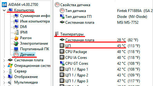 Температура Первая причина – это конечно же перегрев! Если какие-то из комплектующих в системном блоке у Вас перегреваются, то это является одной из самых главных причин почему тормозит Ваш компьютер или перезагружается, или же выключается во время работы. Вам нужно убедиться, что компьютер не перегревается. Для этого можно использовать какие-нибудь программы, одна из таких называется - AIDA64. Скачайте эту программу, установите и запустите. Нам нужно перейти на вкладку Компьютер затем Датчики, и тут мы можем посмотреть температуру всех комплектующих...