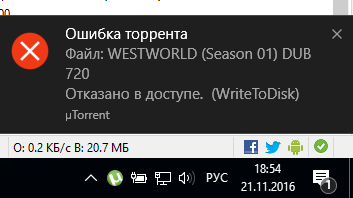 *** …Намедни попросили меня разобраться с очередным загадочным сбоем. При работе торрент-клиента μTorrent над значком приложения (в области уведомлений Панели задач) появилось всплывающее окно с сообщением «Ошибка торрента. Файл:… Отказано в доступе. (WriteToDisk)». После этого скачивание торрент-файла прекратилось. При появлении подобных сбоев:...