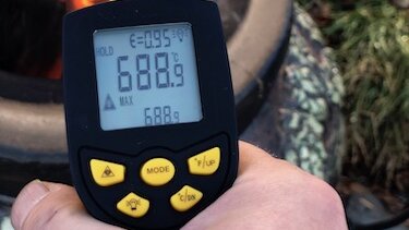 На улице -3°С, погода хорошая и мы собираемся топить тандыр. На корпусе еще не растопленного тандыра температура около 2°С. Как и положено, при растопке в холодное время, мы начинаем постепенно разогревать тандыр, подкладывая небольшие дрова. В нашем случае - это всегда береза или дуб. Минут через 35-30, мы подкладываем основную порцию дров и снимаем показания. На корпусе 58°С, внутри тандыра около 690°С. Такой перепад под силу огнеупорной керамике, но трещины начинают появляться. Дрова прогорают в течении часа и корпус разогревается...