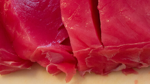 Мясо тунца имеет красный цвет, оно напоминает говядину. Красный цвет мясу тунца обеспечивает в крови белок миоглобин — он вырабатывается при движении на большой скорости.