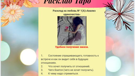 Если вы долгое время одиноки, то стоит задуматься, а все ли вы делаете правильно? Я не говорю о том, что в вас непременно ВСЕ не так и вы совершаете много ошибок. Вовсе нет. Просто нужно узнать, какие причины мешают вам встретить достойного мужчину и построить счастливые, гармоничные отношения. И расклад на “Анализ одиночества” именно для вас! У меня тоже были моменты, когда я была одна. Но мне казалось, НЕТ, Я НЕ ОДИНОКА, Я ПРОСТО ВРЕМЕННО ОДНА, но уже очень скоро встречу ЕГО… В общем...