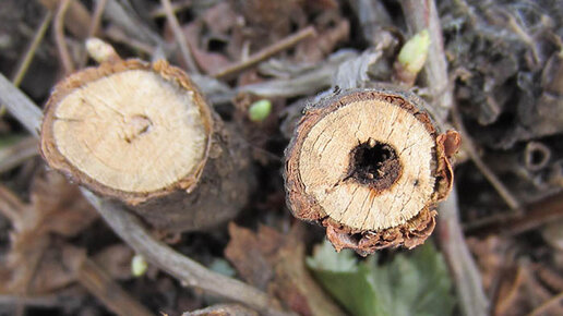 Во время обрезки кустов смородины убирают старые и больные ветки, формируют крону растения. По цвету древесины на срезах можно увидеть, как перезимовало растение, какие у него проблемы в росте и развитии. Срезы черного цвета – признак серьезной болезни смородины. Черная древесина внутри ветки показывает, что в смородиновом кусте завелся вредитель стеклянница. Стеклянница это небольшая (размах крыльев около 2 см) бабочка, по виду похожая на осу. Туловище у нее черного цвета, с небольшими желтыми полосками...