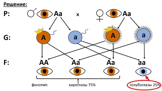Вот такой вопрос. Ну что ж? Будем решать его как генетическую задачу. Напомню, что при оформлении генетических задач используют следующие обозначения: большая латинская буква – доминантный ген маленькая латинская буква– рецессивный ген Р – родители (от от латинского слова parenta – родители) Х - знак скрещивания G – знак, указывающий на гаметы, то есть на типы половых клеток, сперматозоидов и яйцеклеток, образующиеся у родителей. Напоминаю, что в каждую гамету отправляется по одному гену, отвечающему за каждый признак организма...