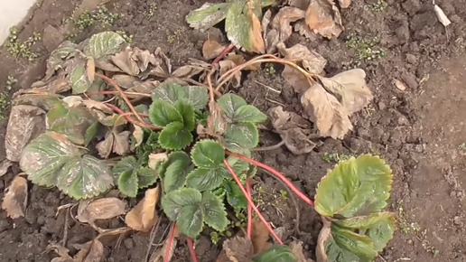 Конец апреля, московская область. Вот так сейчас выглядят кустики клубники. Что с ними нужно сделать сейчас. Первое, - нужно убрать все сухие старые листья. Обрезаем их как можно ближе к кусту. Вот они, прошлогодние эти листочки. Обязательно их убираем с участка, лучше всего их сжечь, потому что они являются распространителями болезнетворных микроорганизмов, а также вредителей. Кстати очень удобно пользоваться вот такими ножницами, они с пружинкой, как бы мини секатор. Не пытайтесь эти листики просто выдернуть, оторвать руками...