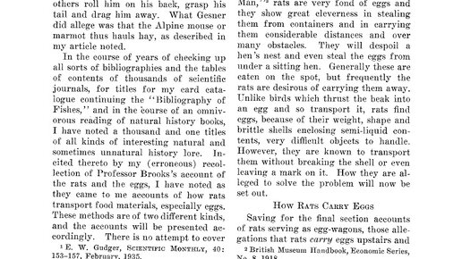 Предыдущий видос посвящён вопросу, который давно меня волнует: как крысы переносят птичьи яйца, не повредив скорлупу? Проверке же подлежит миф об использовании крысами своих собратьев "в качестве анимированной тележки" - цитата из фотодокумента в заголовке. Короче, правда ли, что крыса-вор ложится на живот, крепко обхватывая яйцо ручонками, а подельники тащут её за хвост в гнездо? Обсуждение этого факта в статье из архива Американского музея естественной истории заняло десять страниц! Но в публичном...