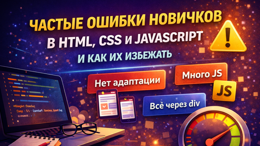 Если ты только начинаешь путь в веб-разработке, ошибки — это нормально. Проблема не в том, что они есть, а в том, что одни и те же ошибки совершают почти все новички. В этой статье разберём: Новички часто: Очень распространённая проблема. ❌ всё — div ✔ использовать семантические теги Плюсы: Новички любят писать длинные селекторы. Очень опасная ошибка. Новичок: JS — это не всегда решение. ❌ делать всё через JS ✔ сначала подумать про CSS Если можно сделать эффект через :hover — делай через CSS...