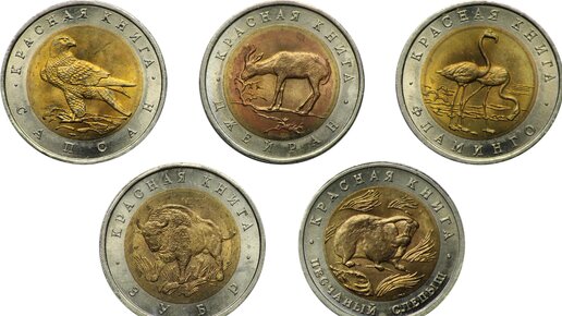 Всех приветствую, сегодня у нас речь пойдёт о юбилейных монетах, которые начали чеканить при Советском Союзе, а продолжили уже в России. Одна из интересных серий юбилеек и к тому же не самая дешёвая. И это "Красная книга" выполненная в биметалле. Начало чекана началось в 1991 году, ещё при СССР. Сплав из которого делали монеты состоял из латуни(цетр) и медно-никеля (кольцо). Вес каждой монеты был 6,25 грамма. Диаметр 25мм, а толщина 1,95. Гурт гладкий с ребристыми участками. При Советах успели выйти только 2 монеты: это Винторогий козел и Рыбный филин...
