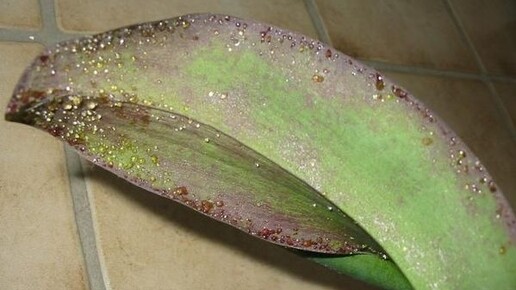 Капли липкие на листьях орхидеи ,Срочно убрать , чтоб не погибла
