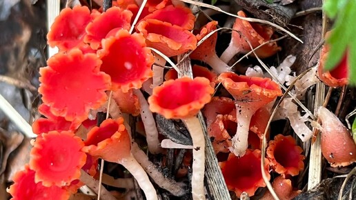 Прелестный маленький грибок, яркого алого цвета. Похож на маленькие цветы экзотических растений, это - Находки гриба очень редки, хотя его распространение почти повсеместно. Вот на сегодня (12.04.25) показываю зафиксированные на Айнате находки микростомы в Центре России (см. карту ниже). И это не "плохо видно", а так мало найдено этих грибов. Два места отмечены находками с нашего канала, отличились "Книга Грибов" и "сергей п", см стрелочки на карте. Понятно, что не все грибники в Айнатуралист выкладывают фото, но даже для редкой и краснокнижной саркосомы отмечено гораздо больше находок...