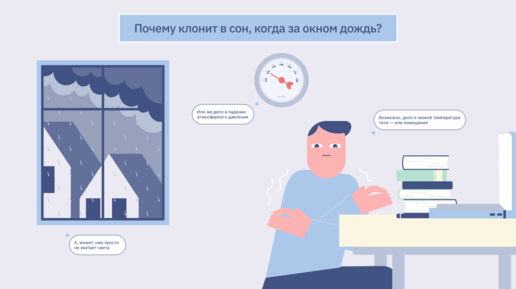 Дождь — белый шум, усыпляющий мозг, а отсутствие солнца запускает выработку мелатонина. Вот почему так хочется спать.