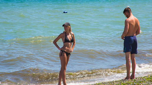 Евпатория Крым. Отдыхающие лезут купаться в холодное море. Водоросли на пляже.