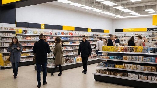 Яркие жёлто-чёрные вывески, аккуратные полки с товарами по