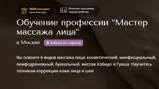 Мы провели анализ всех курсов массажа лица в России и выбрали 30 лучших программ, чтобы вы могли системно освоить лифтинг-техники, лимфодренаж, буккальный и скульптурный массаж. Подборка учитывает качество практики, методики наставничества и карьерные перспективы в эстетической косметологии. «Все очень понравилось, приветливый администратор, отлично оборудованы классы, а главное — квалифицированный преподаватель, который делится самым важным в деле массажа.» — Антон «Это действительно практические курсы: преподаватель подробно объяснял материал и все показывал...