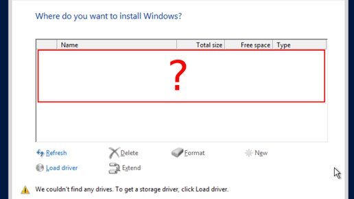 Почти все хостинг-провайдеры предлагают свои образы операционных систем для быстрого развёртывания виртуальных машин. Если по какой-то причине потребуется развернуть Windows из собственного образа, есть риск столкнуться с проблемами обнаружения запоминающих устройств: Я сталкивался с таким у Selectel и Hetzner, но у коллег были проблемы и с другими хостерами. Вся причина в отсутствии драйверов, которые необходимо либо подгрузить с другого iso-образа, либо вшить в установочный образ Windows самостоятельно...