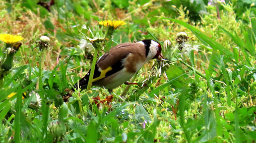 Как то в апреле, гуляя в городском парке, мне попалась небольшая стайка щеглов на газоне с одуванчиками. Они так весело бегали от цветочка к цветочку! Я обратила внимание, что такая довольно ярка птичка почти совсем не видна в траве! Кстати, о щеглах есть старинное предание, откуда у них взялось красное пятно. По старинному преданию, по дороге на Голгофу именно щегол вытащил терновую колючку из брови Христа...