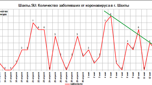 Анализ информации из официальных источников в мониторинге портала Шахты.SU показывает, что пик заболеваемости коронавирусной инфекцией город уже прошёл. Высшая точка пришлась на 4 и 5 мая. Напомним, по данным на 5 мая в числе семи новых заболевших оказались шестеро детей из одной многодетной семьи, которые заразились от ранее заболевшего члена семьи. На рекордную "высоту" - 11 заболевших - город поднялся 5 мая по данным, полученным 6 мая, тогда семеро из новичков оказались вахтовиками, вернувшимися домой на майские праздники...