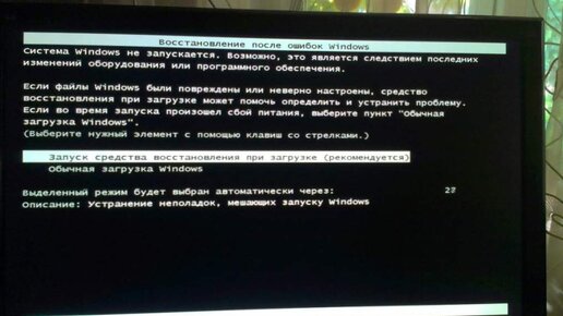 Всем привет. Половина обращений пользователей всех видов ПК и ноутбуков. Помогите! У меня черный экран! При этом видов этой распространенной ошибки несколько, как собственно и причин её возникновения. Давайте я покажу вам какие они есть и что вам нужно делать когда видите например вот такую картинку: 1. Когда перед вами такая картинка, нужно нажать на клавиатуре стрелочку вниз, выбрав надпись обыкновенная загрузка виндовс. Ибо совершенно не помню, что бы мне помогла хоть раз функция восстановления...