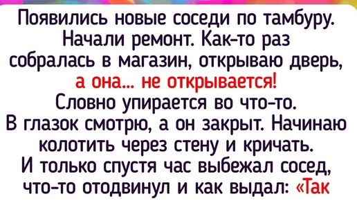Неважно, живем мы в многоквартирном доме или же в большом частном особняке, соседи всегда будут рядом. Хорошо, если повезло и они оказались приветливыми и дружелюбными. Но бывает и так, что вместо приятных чаепитий приходится сталкиваться с постоянными конфликтами или непонятными ситуациями. Появились новые соседи по тамбуру. Начали ремонт. Как-то раз собралась в магазин, открываю дверь, а она... не открывается! Словно упирается во что-то. В глазок смотрю, а он закрыт. Начинаю колотить через стену и кричать...