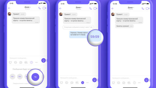 Viber сделал исчезающие сообщения доступными для личных чатов, в которых пользователи мессенджера общаются каждый день. Теперь, если пользователь хочет, чтобы информация, которую он отправил своему собеседнику, стерлась через некоторое время после прочтения, достаточно при отправки сообщения, фотографии или видео установить таймер. Ранее функция исчезновения сообщений была доступна только пользователям секретных чатов. Новая функция очень удобна: так, с каждым контактом можно общаться в одном месте и не заводить отдельный секретный чат, когда, например, нужно отправить номер банковской карты...