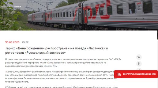 РЖД громко и помпезно объявляет о скидках и акциях, а об их отмене сообщает тихо и незаметно. К сожалению, я недавно столкнулась с такой неприятной ситуацией. В этом году день рождения я планировала провести в Карелии: проехать на ретропоезде в Рускеалу и побывать в Карельском зоопарке. Тем более, что для именинников РЖД предлагали на билеты 30%. Причем не только имениннику, но и трем его сопровождающим. Об этом писали многие блоггеры, да и на сайте железнодорожной компании до сих пор висит соответствующее объявление...