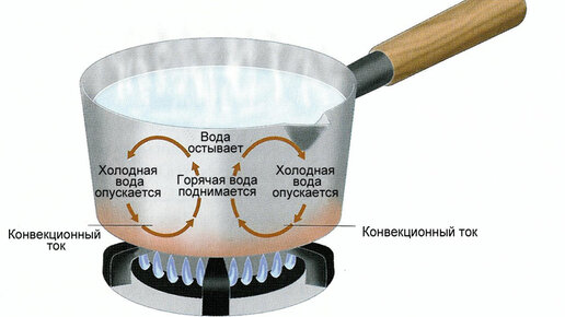 Вода - плохой проводник теплоты, а воздух еще хуже. Почему же тогда вода быстро прогревается в чайнике, температура воздуха в разных частях комнаты одинакова? Причина этого - земная гравитация, а процесс, возникающий в газах и жидкостях под действием земного притяжения называется конвекцией. Вода в чайнике полностью и быстро прогревается, так как нижние слои, нагреваясь, расширяются, становятся легче и поднимаются вверх, а их занимают более тяжелые, холодные слои. Нагреть воду в невесомости будет не так то просто...