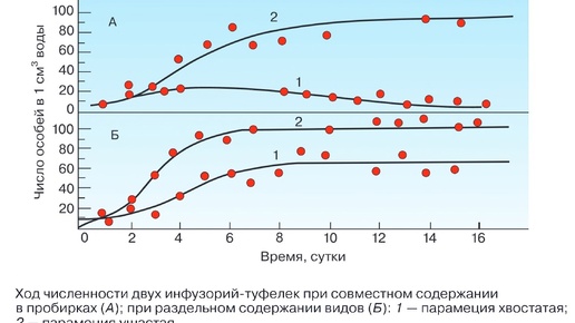 При попытках разводить в лабораторных условиях совместно два вида, питающихся од- всегда получают сходный результат. Через ряд поколений, рано или поздно, один вид исчезает, а другой остаётся. Впервые это было показано Г. Ф. Гаузе на опыте с инфузориями (рис. 46). Он содержал два близких вида — туфельку хвостатую и туфельку ушастую в сенном настое порознь и вместе. Обе туфельки питаются бактериальной взвесью и хорошо выживают и размножаются в пробирках по отдельности. Там же, где они были помещены совместно, постепенно снижала темп размножения и исчезала...