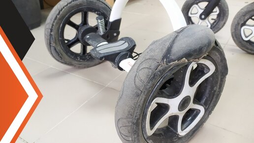 У детских колясок с надувными колесами довольно часто прокалываются камеры или рвутся покрышки. В данном случае наш клиент сорвал "ДЖЕКПОТ". Все 4 покрышки в труху. Такое случается, когда нет контроля за давлением в колесах детской коляски. На спущенной резине ездить нельзя. Это как минимум не удобно. Тягать коляску в таком состоянии не то что нужно молодой маме, да еще после родов, если конечно вы не готовитесь к выступлениям...