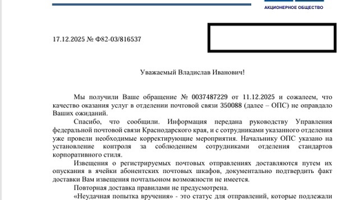 Инцидент закрыт, нарушитель не наказан. Как работает “служебная проверка” в Почте России. Им указали начальнику. Мне - новый чек и вторая очередь. Реальная цена извинений Почты. Учебник по бюрократии: как ответить на жалобу, не ответив ни на один вопрос. Искренне ценим ваше обращение. Искренне надеемся, что вы отста́нете. Подача обращения в органы прокуратуры № 6628801662. Действия. Заявление получено ведомством. Сегодня в 23:06 ЖАЛОБА В ПРОКУРАТУРУ КОПИЯ: Генеральному директору АО «Почта России»...