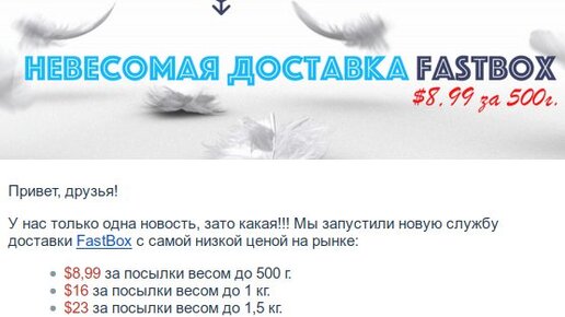 Американский почтовый посредник Pochtoy предложил курьерскую доставку до пункта самовывоза Boxberry - Fastbox. Стоимость доставки посылки весом до 500 гр. - $8.99, посылки до 1 кг - $16, посылки до 1,5 кг - $23. Фактически Fastbox является аналогом доставки Shopfans Lite, которая также не предполагает объединения и переупаковки посылок. Посылки Fastbox отправляются, как есть, просто на входящую посылку наклеивается этикетка с вашим адресом в России. В отличии от Шопфанс Лайт, метод доставки Fastbox позволяет страховать посылки от недоставки (утери), кражи и порчи вложений...