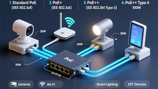 1. IEEE 802.3af (PoE) ПРИМЕНЕНИЕ: 2. IEEE 802.3at (PoE+) ПРИМЕНЕНИЕ: 3. IEEE 802.3bt Type 3 (PoE++) ПРИМЕНЕНИЕ: 4. IEEE 802.3bt Type 4 (PoE++) ПРИМЕНЕНИЕ: 5. Passive PoE (Пассивный PoE) ПРИМЕНЕНИЕ: PSE...