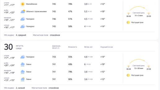 К концу подходит лето, и осень уже ощущается — последние дни погода была неприятной, с ливнями и сильным ветром. Два раза МЧС предупреждало о неблагоприятных метеоусловиях за последнюю неделю.И тем не менее, в конце августа хочется проводить лето с достоинством. Так какая погода ожидает нас в последние три дня месяца — 29, 30 и 31 августа? Яндекс.Погода По данным сервиса, дожди ожидаются только 30 августа. Сегодня же, 29 августа, хоть и будет царить преимущественно пасмурная погода, но она будет тёплой (до +22 градусов) и маловетренной...