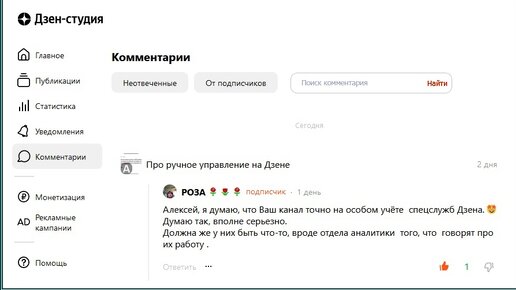 Всем привет! Сегодня я искал пару комментариев на канале, которые должны были стать основой для моей следующей публикации. Однако, поиск требуемых комментариев затянулся надолго... Почему бы на Дзене не сделать поиск по комментариям? Требуемые комментарии, разумеется, я нашёл, однако, я потратил на это уйму времени! А вот если бы... в студии в разделе "Комментарии" рядом с кнопками "Неотвеченные" и "От подписчиков" была реализована строка поиска по комментариям [например, как поиск по публикациям],...