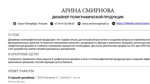 Посмотрите пример резюме дизайнера полиграфической продукции, чтобы понять, как правильно составить свою карьерную историю. Используйте готовые примеры как основу для создания эффективного резюме, которое поможет вам получить работу мечты ✨. На этой странице вы найдете исчерпывающее руководство о том, как составить резюме дизайнера полиграфической продукции, учитывая актуальные требования работодателей. Изучив пример, вы сможете создать резюме с помощью нашего конструктора резюме. Заголовок резюме должен быть четким, профессиональным и отражать вашу специализацию...
