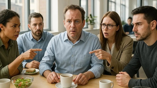Столовая на третьем этаже гудела, как улей. Обеденный перерыв в самом разгаре — люди с подносами снуют между столиками, где-то звякает посуда, пахнет котлетами и кофе. За угловым столом у окна расположилась наша компания — человек семь из отдела разработки и пару бухгалтеров, которые давно к нам прибились. Максим Воронов, ведущий разработчик, допивал свой кофе и, как обычно, жаловался на жизнь. Точнее, на жену. — Представляете, прихожу вчера в десять вечера — проект горел, засиделся. Так эта моя благоверная даже не спросила, как день прошёл...