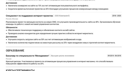 Изучите готовый пример резюме помощника менеджера интернет-проектов, чтобы понять, как составить свой идеальный документ. Используйте его как основу для создания эффективного резюме, которое поможет вам получить желаемую работу в этой востребованной сфере. В этой статье представлено подробное руководство по созданию успешного резюме помощника менеджера интернет-проектов, актуальное как для начинающих, так и для опытных специалистов. Здесь вы найдете: Изучив пример, вы сможете создать резюме с помощью нашего конструктора резюме...