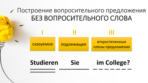 Вопросительное предложение с вопросительным словом В вопросительном предложении порядок слов зависит от того, есть ли в предложении вопросительное слово или нет. В немецком языке все вопросительные слова начинаются на «w»: Если есть вопросительное слово, то с него следует начинать вопрос, затем уже идут сказуемое, подлежащее и т.д. Пример Was studieren Sie im College? Wohin gehst du heute Abend? Wo wohnst du? Вопросительное предложение без вопросительного слова Если в вопросе нет вопросительного слова, то начинать предложение нужно со сказуемого, затем употребить подлежащее и т...