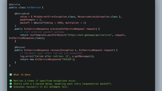 Если ваш сервис обращается к внешним API — рано или поздно они начнут падать, тормозить или отдавать ошибки. Вместо ручной логики повторов используйте @Retryable. Что это даёт: - Автоматические повторные запросы при ошибках - Настраиваемое количество попыток - Exponential backoff (увеличение задержки между попытками)...
